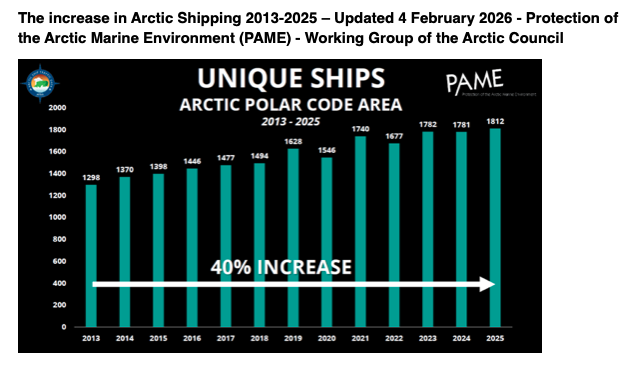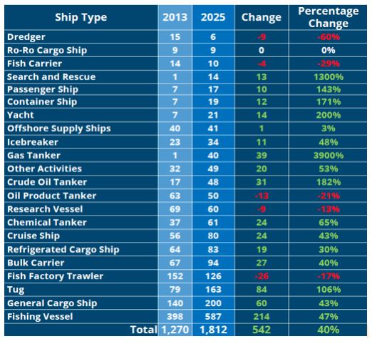 Accanto alla componente dominante – pesca e traffici locali – crescono le navi legate all’energia e alla logistica. L’aumento di gas carrier e petroliere riflette il ruolo dell’Artico come piattaforma energetica, mentre bulk carrier e general cargo indicano un utilizzo più strutturato per il trasporto di risorse. Ancora limitato ma significativo è l’ingresso delle portacontainer, come dimostra il viaggio della Istanbul Bridge, con tempi ridotti a circa 18–20 giorni tra Asia ed Europa.